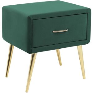 Upholstered Nightstand with Drawer. Bring a glamorous vibe into your bedroom with this bedside table. Made out of durable, easy-to-take-care-of velvet, it is certain to draw the attention of everyone in your home. Its emerald green colour is complemented by a set of gold-coloured legs, made of iron, which ensure stability. A drawer, that is a part of the construction, will let you store away your unnecessary things, but can be also used as a storage for books or newspapers. Details: Product Type: Bedside Table Style: Glam General Color: Green, Gold Shade: Emerald Green Material Type: Fabric Main Material: Velvet Additional Material: Iron Legs material: Metal Material Composition: 100% Polyester Drawers: Yes Leg Caps/ Pads: No Number of Drawers: 1 Shelves: No Dimensions: Depth: 38 cm Width: 46 cm Height: 49 cm Weight: 16 kg Drawer Weight Capacity: 10 kg Top Weight Capacity: 25 kg Offer Includes: 1 x Bedside Table Key Features: Elegant Design, Intriguing Combination of Colours, Stable