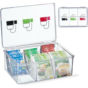 This tea bag box with transparent design is ideal if you want to store different types of tea in a clear way and preserve their aroma. The 6 compartments each hold 10 tea bags so your favourite varieties are always within reach. The tea container means no more annoying searching in the storage cupboard and it is a simple yet eye-catching piece for the kitchen shelf and worktop. The sturdy tea box with hinged lid is made of eaplastic and can be wiped clean with a damp cloth. Tea Box in Detail - Dimensions H x W x D: approx. 9 x 21.5 x 15 cm - Dimensions of compartments H x W x D: approx. 7.5 x 6.5 x 6.5 cm - Weight: approx. 260 g - Material: Plastic - Colour: Transparent Tea Organiser with Lid - 6 compartments for clear storage of approx. 60 teabags - Clear design with teabag design and 'tea time' text - Hinged lid makes it easy to grab your favourite tea - Plastic can be wiped clean with a damp cloth - A simple piece for the kitchen worktop or shelf Included in Delivery - 1 x tea box