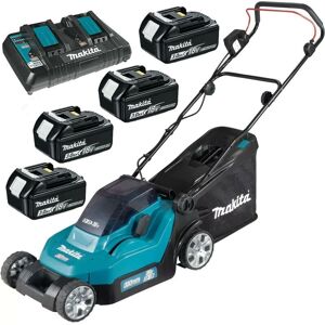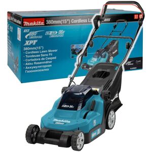 Cost-competitive 380mm cordless lawn mower powered by two 18V Li-ion batteries in series. Recommended for lawns up to 560m2 . The Makita DLM382PT4 is powered by two 5.0ah 18v Li-ion batteries in series to supply energy to the powerful 36V DC motor drive system. Comes with a battery capacity warning lamp. Recommended for lawns up to 560m2 Electric brake Powered by two 18V Li-ion batteries in series to supply energy to the powerful 36V DC motor drive system. Single lever cutting height adjustment for quick adjustment of 13 cutting heights Grass box with grass level indicator Rubberised handle bar Low noise and vibration Includes: 4 x 5.0ah Batteries Dual Port Charger