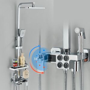 Shower Fixture Wall Mounted Shower Unit Rainfall Shower Head Bidet Spray Tub Spout Temperature Display Bathroom Exposed Shower Faucet Set System . Thermostatic Shower Column of the shower fixtures has a water temperature display function, you can know the water temperature at a glance. Our thermostatic shower system is equipped with a safety lock at 38°C protects you and your family against scalding-hot water High-quality prevents to be discolored. High-quality brass construction in corrosion and rust-resistant for durability and reliability. The LCD electronic display shows your shower time, temperature and the shower function currently being used at all times.The faucet body is made of solid brass, which is corrosion resistant and durable.The shower mode can be easily switched at the push of a button, and the four modes can be switched at will to suit your shower habits.This shower faucet set has a 3-mode Hand Sprayer: Rain Handheld Shower+Mist Spray Shower+Mix Hand Shower. You can easily switch three functions to meet your shower habit.This bathroom exposed shower system's overall height of the shower fixture: 82-120 cm (32.6- 47.2 inches), comes with a Shower Shelf. The height of the hand shower bracket is also adjustable, offering you a good experience of the shower. Wall-mounted shower fixture is 2 holes installation.This complements most transitional styles, and the appearance is high-end and atmospheric, a good choice for your modern bathroom. Function: Shower System Valve Material: Brass Hand Shower Material: ABS Shower Head Material: ABS Shower Head Size: 8 inch Product Height: 730~1160 mm Easy to install Finish: Chrome Functions: 4 Way (Rainfall,Hand Shower,Tub Spout,bidet sprayer) Single switch control. One function at a time. Installation Method: Wall Mounted 59" long stainless steel chrome hand shower hose Water Flow: 1.8 GPM Belfry Bathroom