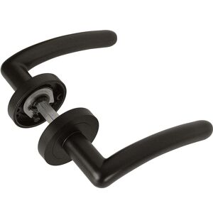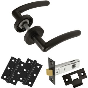 Z16 value pack black curved lever door handles including a set of 3 inch (75mm) black hinges and a 3 inch (75mm) black latch all as part of one door handle pack. These handles are a stunning finish with the highest quality of manufacture. Made from metal based zinc alloy it is no surprise that customers love this handle. A good weighty feel along with a modern contemporary design will adorn your doors with a truly stylish look. Everything is included in the box including the spindle and screws and colour matched in a modern day matt black finish.