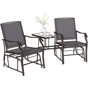 "Enjoy relaxation time with a friend thanks to this Outsunny jack and jill seat. The steel frame means a strong, supportive structure - crafted in a smooth, individual gliding design to allow you to drift away peacefully at your own pace. The middle glass table provides a handy holding spot for both of you. So, whether it's for relaxing with a friend or by yourself, this tete a tete seat is great for taking a well deserved rest. Specifications: ● Colour: Brown frame, grey fabric ● Material: Steel, Mesh fabric ● Overall Dimension: 195L x 81W x 89Hcm ● Seat Size: 55W x 51Dcm ● Seat to Floor Height: 43cm ● Table Size: 49.3L x 43.3Wcm ● Weight Capacity: Chair: 160kg. Table: 15kg ● Item Label: 84A-084 Features: ● Gliding seat duo set with glass middle table. Room for two ● Seats can glide individually or simultaneously ● Mesh fabric on chairs is soft and breathable ● Steel frame for strength and durability ● High backs and arms support your body ● Assembly required "