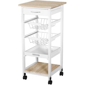 This compact cart is ideal for small home spaces which require extra storage. It features a top drawer for utensils, two metal wire baskets, a slide-out tray and bottom shelf, giving you lots of handy space for the kitchen and beyond. Each tray can be taken out and used separately if wanted. It comes with four wheels on the bottom so you can move it around easily. A beautiful white and natural wood-effect design which will look good standing almost anywhere. HOMCOM Mobile Rolling Kitchen Island Trolley for Home Metal Baskets in White