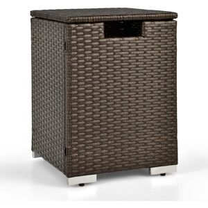 With 2-in-1 multifunctional design, this hideaway gas tank table perfectly combines practicality and style.The table not only serves as a perfect cover for a 9 kg propane gas cylinder (not included), but also can transform into a charming side table when the lid is closed. The hand-woven rattan surface not only adds to its visual appeal but also ensures longevity. Plus, the heavy-duty metal frame boasts durability and resistance to deformation and rust. The adjustable footpads further enhance the overall stability, ensuring a solid foundation. Embrace the convenience and functionality of the gas tank storage side table! The thoughtful design, sturdy construction, and elegant look make it a perfect addition to your outdoor furniture collection. 17 Stories
