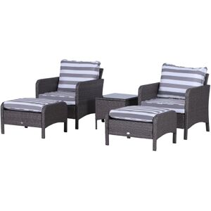 Feature: Five-piece set formed of two outdoor armchairs, two footstools and a matching coffee table All hand woven PE rattan base with a steel frame for reinforced strength Sleek tempered glass top on the table 10cm thick padded cushions on chairs for many hours of comfort and relaxation Low maintenance and easy to move around Two footstools include you can relax your feet, or use it as an extra seat Assembly required Specification: Colour: Dark Grey, Grey and White Strip colour Material: PE Rattan, Steel, Polyester Armchair Dimension: 71L x 67W x 75H cm Ottoman Dimension: 67L x 51W x 40H cm Coffee Table Dimension: 46L x 46W x 42Hcm Seat Size:60Wx59Dcm Seat Height: 30cm Back Height: 47cm Cushion Thickness: 10cm Weight Capacity: 160kg (armchair), 70kg (ottoman), 30kg (table) Item Label: 860-066V01CGJust so you know: this item ships and arrives in separate boxes. Delivery times may vary with each box. Box quantity: 2 2 x Armchair 2 x Ottoman 1 x Table 4 x Seat Cushion 2 x Back Cushion 1 x Manual Just so you know: this item ships and arrives in separate boxes. Delivery times may vary with each box. Box quantity: 2