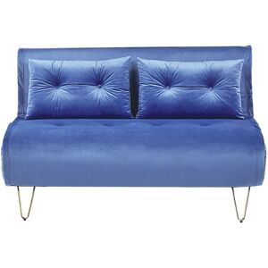 2 Seater Velvet Sleeper Sofa. Bring a glamorous feel to your interior with this functional and alluring sofa bed. Its upholstery made of durable velvet is exceptionally soft to the touch, and the thick padding makes it a truly comfortable piece. The upscale look of the furniture is emphasized with the gold metal legs. The additional cushions with button tufting and removable cover adds a bit of charm and cosiness to the couch. Moreover, thanks to the easy to operate sleeper function, you do not need to worry whenever your guests want to sleep over at your place. Details: Product Type: 2 Seater Sofa Style: Modern General Color: Blue, Gold Shade: Navy Blue Material Type: Fabric Main Material: Velvet Additional Material: Iron Filling Material: Foam Material Composition: 100% Polyester Arm Style: Armless Leg Caps/ Pads: Yes Reclining: No Removable Cushion Covers: Yes Seat Construction: Sinuous Springs Seat Foam Density: 50 kg/m3 Seats Up To: 2 People Sleeper Function: Yes Sofa Bed Open