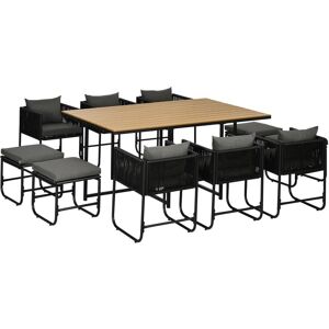 An inviting setting for all great for garden and other outdoor areas. Solid metal for a strong frame, with plastic wicker for the chairs to offer double the durability; the fringed design for a cool look. The wood grain plastic tabletop is tough and easy to clean. Both chairs and stools come with padded cushions for comfort. When done, you can tuck the chairs and stools under the table, so they don't get in the way. OUTSUNNY Rattan Dining Set, Garden Table & Chair Sets w/ Space-saving Design in Black Size: 11 Pack