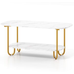 Elevate your living space with our exquisite coffee table, featuring a luxurious faux marble tabletop and a stunning golden frame that adds a touch of opulence to any room. Crafted from premium plates with a waterproof surface, this table is not only elegant but also durable for long-lasting use. The heavy-duty steel frame ensures stability, making it perfect for holding your essentials. With a versatile 2-tier design, you can store coffee cups, plants, laptops, magazines, or consoles conveniently. The rust-resistant powder-coated metal parts guarantee durability, while the 4 anti-slip foot pads provide floor protection and extra stability. Bring both style and quality to your home with this chic coffee table. Bullet Point: Modern and Chic Look: Our coffee table features a faux marble tabletop that can easily create a luxurious atmosphere. The golden frame makes the coffee table look more sophisticated. This stylish coffee table is suitable for different styles of home. Premium