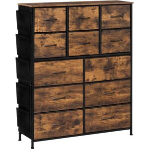 IDEAL STORAGE SOLUTION: The chest has 12 fabric drawers in 2 sizes and 5 side pockets. The drawers can be used to store a variety of clothes by category, the side pockets can be used to store underwear, socks and other small items, and the top can be used to store vases, picture frames, etc., keeping the room tidy and saving time and effort STABLE CONSTRUCTION: The rust-proof metal frame, E1 grade engineered wood cabinet top, plus fabric drawers with tough cardboards and MDF boards inside, create this stable and durable bedroom furniture, which can hold up to 50kg. In addition, it is equipped with anti-tip devices and X-bars to make it safer and more stable FLOOR-FRIENDLY VINTAGE CABINET: The mix of vintage brown and black with bridge-shaped handles gives this storage unit an elegant and vintage vibe to your home. The adjustable feet can fit better on a variety of floors without damaging them AN ALL-ROUNDER: This vintage cabinet is practical to be used as a living room sideboard,