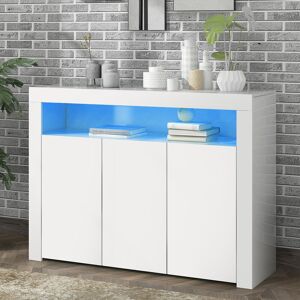 Combines with minimalism inspiration and smooth lines design, this sideboard can bring vogue and elegance to any traditional and modern house. High gloss effect finish to the front of the unit (including doors and front panels), the rest of the body in a matt finish, contemporary and stylish. LED lights has 16 colors and 4 lighting effects such as strobe and fade, can change the color of the display through the remote control. USB interface . This utility 3 doors sideboard storage cabinet with open cubby space and adjustable shelves designed to store household unit, space utilization and prevent dust. LED sideboard is made of high quality, durable and environmental Laminated Chipboard , all surfaces are water resistant and easy to clean. Specification: Product name: LED Sideboard Material: Chipboard, LED light Color: white Weight: 49.4kg/108.9lb Product Size: 130*35*95 cm Weight capacity: 100kg 2 packages. Assemble Needed, tools and instruction included.