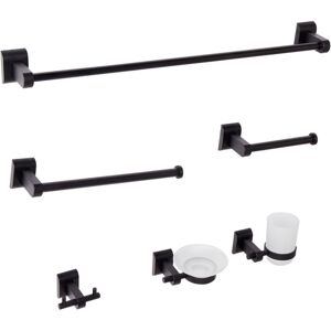 Chic Bathroom Hardware Set. Complete your bathroom’s look with this modern hardware set crafted from durable aluminium. Designed for easy installation and low maintenance, it features six components: a hook, two towel bars in varying sizes, and holders for toilet paper, soap dish, and a tumbler. A glass soap dish and tumbler are included to give your bathroom a cohesive and tidy appearance. Details: Product Type: Bathroom Hardware Set Style: Modern General Color: Black Material Type: Metal Main Material: Aluminium Additional Material: Glass Finish: Matt Dimensions: Depth: 7 cm Width: 61 cm Height: 6 cm Overall Dimensions: 61x7x6 Weight: 1.5 kg Weight Capacity: 10 kg Offer Includes: 2 x Towel Bar, 1 x Towel Hook, 1 x Toilet Roll Holder, 1 x Soap Dish Holder, 1 x Tumbler Holder, 1 x Soap Dish, 1 x Tumbler Key Features: Modern Design, Blends Well with Any Decor, High-Quality Materials, Unique Handmade Piece, Secure Mounting Thanks to Durable Screws and Pegs Assembly Information: Requires