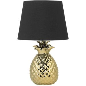 Fruit-inspired Bedside Table Lamp. Give your interiors a touch of uniqueness with this fruit-inspired ambient table lamp. This quirky lighting piece will be a perfect addition to any modern, contemporary, or vintage home decor. Crafted from high-quality ceramic, it is highly durable yet stable. Finished in a stylish gold colour, it will match the majority of house styles. The lamp features a textured cone shade in white. Light up your surroundings with this one of a kind pineapple lamp. Details: Product Type: Kids Lamp Style: Modern General Color: Gold, Black Material Type: Fabric Main Material: Ceramic Additional Material: Fabric Base Material: Ceramic Shade Material: Fabric Material Composition: 100% Polyester Wattage: Max. 40 W Finish: Gloss IP Protection Code: IP 20 Light Bulbs Required: 1 Voltage rating: 230 V (50 Hz) Dimensions: Base Dimensions: 12x12 Cord Length: 144 cm Depth: 32 cm Width: 32 cm Height: 52 cm Weight: 3 kg Offer Includes: 1 x Table Lamp, Not Included: Light Bulb