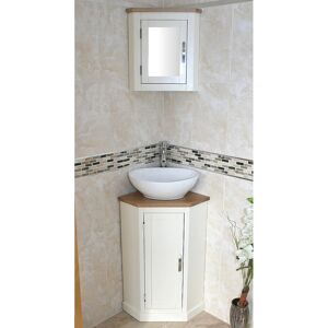 This is an absolutely stunning handcrafted solid oak bathroom freestanding corner vanity unit with a single cupboard with a height-adjustable central shelf. This unit comes complete with an undrilled worktop, a matching solid oak mirrored top cabinet, a basin, a chromed mixer tap with braided connectors, and a chromed pop-up plug. Belfry Bathroom Base Finish: Oak