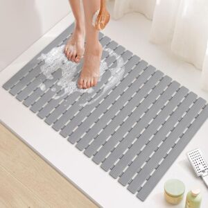 HIGH-QUALITY MATERIAL WITH SUPERIOR GRIP - This bath mat is made of high-quality TPE/PP, which is stronger than ordinary bath mats. The base of the shower mat is covered with powerful suction cups to prevent slipping (not recommended for tiled/textured surfaces). Hold your feet firmly in place, easily and confidently. Non-slip Surface with Foot Massage Effect - This bath mat has an excellent textured surface for better grip. This bath mat features a non-slip pattern that massages your feet, making showering safer and more comfortable. Easy-dry Construction with Innovative Drainage - Unlike other shower mats with small drainage holes, this simple and innovative bath mat has hundreds of open drainage areas to allow water to circulate faster and keep the mat clean. Sturdy and well-designed, this bath mat is very easy to dry - just set it aside! Beautiful modern design - The bathtub liner measures 16 x 25 inches. This bath mat perfectly covers the entire bathtub, giving you great freedom
