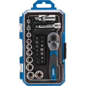 Manufactured from chrome vanadium steel hardened and tempered with a satin finish. Supplied with 72 tooth reversible soft grip ratchet, 12 socket and 14 screwdriver bit socket. Supplied on a socket rack for easy storage and transportation. Manufactured and tested generally in accordance with DIN3122 and ISO3315 Specifications Features and Benefits • Manufactured from satin chrome plated chrome vanadium steel • 12 x sockets • 14 x screwdriver bit sockets • Reversible soft grip ratchet Contents 12 x Socket: 4, 4.5, 5, 5.5, 6, 7, 8, 9, 10, 11, 12, 13mm 3 x Plain slot screwdriver socket bits: 4, 5.5, 7mm 3 x Cross slot screwdriver socket bits: No.1, No.2, No.3 5 x Draper TX-STAR® screwdriver socket bits: T10, T15, T20, T25, T30 3 x Hex screwdriver socket bits: 4, 5, 6mm 1 x 72 tooth reversible ratchet with soft grip handle and "quick release" button