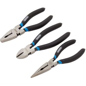 Description This is a 3-piece pliers set designed for general-purpose use. Made from hardened and tempered carbon steel, the pliers feature induction-hardened cutting edges for increased durability. The handles are coated with PVC for a comfortable and secure grip. The set is packaged for display. Technical Specifications Material: Carbon steel, hardened and tempered Cutting edges: Induction hardened Handle: PVC dipped Set includes: 160mm combination pliers, 160mm long nose pliers, 160mm diagonal side cutters Compatibility and Accessories Suitable for various DIY and home improvement tasks involving gripping, cutting, and bending Installation No installation required; ready to use out of the box Usage Use the combination pliers for gripping and twisting Use the long nose pliers for precision gripping and bending in tight spaces Use the diagonal cutters for cutting wires and small materials Other Information Designed for durability and comfortable handling during various tasks