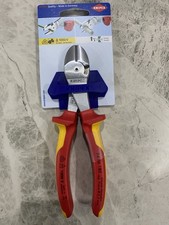 95 18 225 KNIPEX StepCut® XL High-leverage joint, long handles and optimised cutting edges: noticeably easier cutting than with compact cable shears. Large cutting capacity: cuts solid copper or aluminium cables up to 35 mm², stranded cables up to 70 mm²and fine stranded cables up to 120 mm². Dual cutting areas: Stepped cutting edge holds small and larger cables close to the joint during the cut; the front cutting edge cuts very large cables step by step. Easy one- or two-handed operation with minimum handle opening for large cable diameters. Adjustable, high-leverage bolted joint provides precise and smooth cutting. Slim head for easier accessibility. Pinch guard prevents operators' fingers being pinched. Not suitable for steel-reinforced cables, e.g. ACSR. Cutting edges additionally laser-hardened, cutting edge hardness approx. 56 HRC.