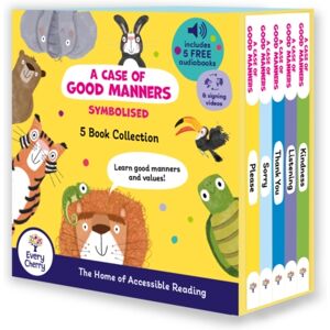Enjoy the brand-new adaption of A Case of Good Manners, where our charming characters learn the importance of manners and how to believe in themselves. Including an opportunity to learn key symbols and signs as they read.Our symbolised editions provide key accessibility features to enable readers to explore the text. Each book includes symbols / visual clues above each word as well as a free audio book to further enhance the reading experience. Every cover will have a sensory feature to assist with sensory output. All Symbolised books are further supported by a signing video.This Box Set Includes:Please,Sorry,Thank You,Listening,Kindness