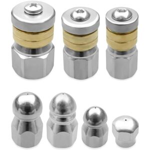 Efficient Unclogging: This kit uses 5000 PSI high-pressure water to swiftly clear grease, debris, and biological build-up. It operates effectively in hot water up to 310°F, reducing the likelihood of severe blockages and maintenance costs by preventing damage. Construction: Crafted from high-quality stainless steel, our Pressure Washer Jetter Nozzle resists rust, corrosion, and wear. Its robust build ensures long-lasting performance, even under harsh conditions, enhancing drainage system efficiency. Versatile Nozzle Selection: Includes 4 sewer jet nozzles and 3 rotary button nose nozzles in various sizes (1/8Inch, 1/4Inch, 3/8Inch), each designed for different cleaning tasks. This comprehensive set meets both residential and commercial cleaning needs. Broad Application: Ideal for more than just sewer cleaning, this nozzle kit excels in cleaning driveways, pipes, motorcycles, floors, , cars, roofs, and sidings. It's a versatile tool for all your indoor and outdoor cleaning