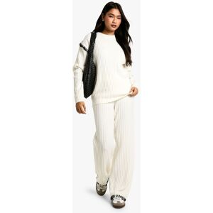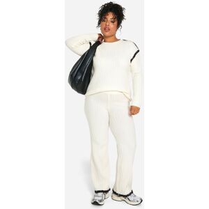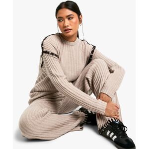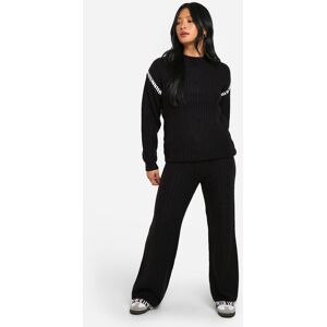 Ribbed knit co-ord set featuring pullover and trousers Crew neckline pullover with contrasting trim detail Relaxed fit trousers with wide-leg silhouette Striking contrast stitching along seams and edges Versatile two-piece ensemble for effortless styling Embrace laid-back luxury with this ribbed knit co-ord set from Boohoo. The pullover and trousers combo offers a perfect blend of comfort and style for the fashion-forward woman. The crew neck jumper features eye-catching contrast trim, adding a contemporary edge to the classic silhouette. Pair with chunky trainers and a crossbody bag for a casual day out, or dress it up with statement earrings and heeled boots for an evening with friends. The wide-leg trousers provide a flattering shape that's ideal for various body types. This set is perfect for those lazy Sundays at home, casual meetups, or even as a chic travel outfit. Its versatility allows for mixing and matching with other wardrobe staples, making it a valuable addition to any fashion enthusiast's collection.