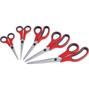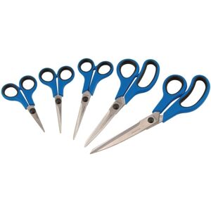 Description This set includes five household scissors made from stainless steel for durability and precision. Each scissors features soft grip handles for comfortable use. The set is ideal for various household cutting tasks and is packaged for display. Technical Specifications Material: Stainless steel Handle: Soft grip for comfort Contents: 5 scissors of different sizes (125mm, 140mm, 170mm, 210mm, 245mm) Compatibility and Accessories Suitable for general household use Does not include additional accessories Installation No installation required Usage Designed for cutting various materials such as paper, fabric, and plastic Handle with care to maintain sharpness and safety Other Information Manufactured by Draper