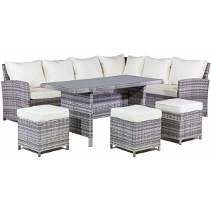 LUXURY RATTAN GARDEN FURNITURE CORNER DINING SET Natural rattan grey weave on this premium corner set. Deep 10cm cushions to give a very comfortable seating experience, cream coloured - Fully assembled sofa's and 3 stools - no assembly required apart for table legs, and sofa side arm - 3 pieces - sofas are fully assembled ,p> NO ASSEMBLY NEEDED Not flat pack - 2 man home delivery , make sure you telephone number is upto date and your current number as we will call to arrange delivery. Sorry but only UK mainland delivery. IN STOCK< ORDER NOW.