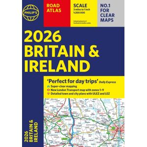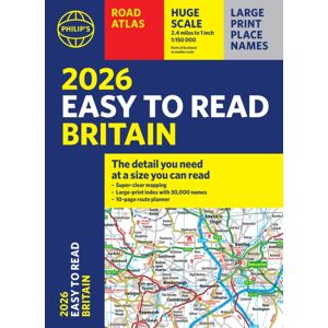 "The detail you need at a size you can read". The latest 2026 Philip's Easy to Read Road Atlas of Britain from the best-selling Road Atlas range has exceptionally clear mapping and everything you need for exploring Britain. With a special lie-flat spiral binding, it will enhance any trip. · Large maps packed with extra details for a better journey· Huge 1:150,000 scale (approx 2.4 miles to 1 inch)· Large print place names· Large print index· 88 detailed town plans for easy navigation· Expanded London ULEZ clearly shown on approach mapping· Super-clear 10-page route planner to create the best journeys· Thousands of attractions clearly mapped, including castles, theme parks, gardens, zoos and more· Over 100,000 copies of the Philip's Easy Read Road Atlases of Britain sold since launch in 2020. At last, a road atlas that everyone can read easily, in or out of the car, no matter what the conditions.With up-to-date mapping technology, your travels have never been easier to plan.This edition contains a wealth of useful information including tourist attractions to ensure the best possible journey. Whether it's getting dark, or if you just can't find your glasses, 2026 Philip's Easy to Read Road Atlas of Britain is the ultimate road companion.
