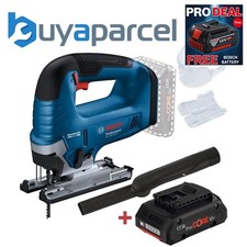 The robust design and the powerful brushless motor of the GST 18V-125 B Professional (with bow handle) ensure increased tool longevity and excellent tool runtime. The cordless jigsaw is a reliable problem solver for all applications at an optimal price-performance ratio in its segment. The GST 18V-125 B Professional keeps it simple with a focus on core important functions such as SDS blade holder, LED, 4-stage pendulum, dust blower and Speed Selection. This cordless jigsaw is ideal for curved and cross cuts in solid wood, chipboard, and wood composites as well as for thicker or harder materials. It can be used with guide rails via adapter. The tool is compatible with external dust extraction and with all Bosch Professional 18V batteries and chargers (Professional 18V System). The baseplate of the GST 18V-125 B Professional can be adjusted up to 45° to make bevel cuts. The tool comes with a removable plastic overshoe to protect sensitive workpieces. Bare unit - battery & charger