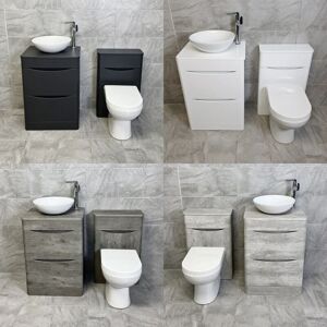 Aegean floorstanding bathroom vanity unit with a countertop Wok Basin & Tap In a choice of 4 colours Contemporary Handle-less design With 2 soft close drawers that can be used for storage With matching worktop Wall Hung Including Charlotte Wok style ceramic basin Including un-slotted basin waste Moonstone units are made in the UK This design is also available in: Matt Dark Grey, Light Concrete or White Gloss Finish With matching 500mm WC unit Includes concealed dual flush cistern with Chrome flush button Echo 2 Rimless BTW Toilet Pan with Soft Close Seat High quality ceramic High gloss glaze Rimless design for easy cleaning Modern styling Including soft close toilet seat With quick release mechanism – seat can be easily removed for cleaning Ideal for use with a WC unit and concealed cistern (not included) Please note: new toilet pan design - see gallery images This design is available in light concrete, dark concrete or white gloss or Matt dark grey finish WC unit sizes approx: Width: