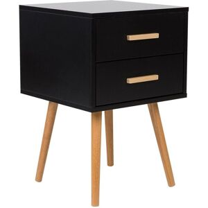 Scandinavian Design Side Table. Bring trendy Scandi decor into your home with this beautiful bedside table, which features a modern look with a minimalist approach. Black front and sides crafted from easy-care MDF create a harmonized look with natural finish bamboo handles. Slim slanted legs made of rubberwood add stability and highlight its modern design. Additionally, the bedside table has 2 capacious drawers for every little thing you want to keep within reach, but at the same time not on display. It is really versatile, you can use this as a nightstand in a bedroom, a small sideboard in a living room or a side table in a hallway. Details: Product Type: Side Table Style: Traditional General Color: Black, Brown Material Type: Wood Main Material: MDF Additional Material: Rubberwood Legs material: Wood Top Material: Engineered Wood Shape: Square Finish: Painted Storage: Yes Dimensions: Width: 40 cm Length: 40 cm Height: 62 cm Weight: 11 kg Weight Capacity: 10 kg Offer Includes: 1 x