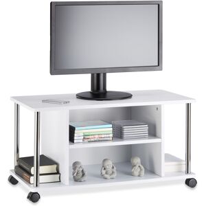 This TV stand is an ideal addition to your living room. You can use the shelving for TV, gaming console, VCR and other devices to have everything in one place. Thanks to a handy cable slot you can connect devices without the cables being visible. However, the rack does not only look great in your living room. Thanks to the handy casters, you can easily move the whole set to wherever you need it most. At the same time, the rack can also brilliantly play other parts: Use it as a side table for your hallway. TV Board Details - Total size H x W x D: app. 35 x 80 x 35 cm - Compartments H x W x D: app. 13 x 37 x 33 cm - Cable slots H x W: app. 4.5 x 4 cm per compartment - Ground clearance: app. 5 cm - Max. capacity: app. 20 kg top, app. 15 kg per compartment - Weight: app. 12 kg - Material: Plastic, PB - Colour: White TV Rack on Casters - For TV, console, VCR and more - Castors for flexibility - With brakes - Subtle design and functionality combined - Cable slot for a neat cable storage