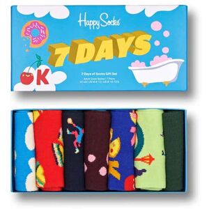 7 Pairs of high socks with different prints to improve your look with a soft fabric.The most hip socks of the moment Happy Socks! These socks are very popular thanks to their original patterns and high quality.Pair of colorful socks with cloud design, studs, tennis, bathtub, cherry+pizza, park and plain green.
