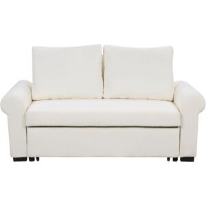 Retro Design Pull-Out Sleeper Sofa. This sofa is a perfect solution for those who value utility and style. Its frame is made from durable and sturdy wood tailored in long-lasting, linen-like polyester fabric. The neutral colour and straight-forward shape make it seamlessly fit within traditional and modern spaces. The piece features rolled armrests influenced by retro design. The sofa can be easily converted into a comfortable bed, thanks to the pull-out mechanism, providing extra sleeping space for your guests. Details: Product Type: Sofa Bed Style: Traditional General Color: White Shade: Off-White Material Type: Fabric Main Material: Fabric Additional Material: Synthetic Material Filling Material: Foam Material Composition: 100% Polyester Arm Style: Rolled-Panel Leg Caps/ Pads: No Reclining: No Removable Cushion Covers: Yes Seat Construction: Elastic Belt Seat Foam Density: 22 kg/m3 Seats Up To: 2 People Sleeper Function: Yes Sofa Bed Open Mechanism: Pull-Out Storage: No Dimensions:
