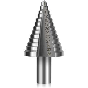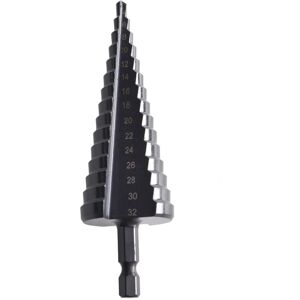 【HSS TITANIUM COATING】 - HSS step drill bit made of high quality HSS steel and coated with titanium to reduce friction and heat. Classic high speed steel, titanium surface coating, proven performance and durability when drilling holes in plastic, wood, aluminum, copper, stainless steel and many other types of sheet metal. 【DANCING-FREE DRILLING】 - The self-centering tip and precise cutting edges of the cone drill drill drill into the material without running. Straight chip flutes provide optimal chip ejection!Dimensions: Height 74mm, Handle Diameter: 7mm 【DUAL CUTTING BLADES & THREE-SIDED SHAFT】 - Dual cutting blades and X-port design ensure faster and smoother cutting; 3-sided shank design can prevent the chuck from slipping; With less pressure, the sets cut wood, sheet metal, steel and other surfaces.