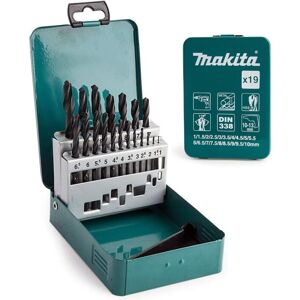 Makita D-54081 HSS Ground Point Set, Multi-Colour 19 Piece 1.5 - 6.5mm + Metal Highly efficient HSS-R drill bits suitable for drilling applications in steel and cast-steel alloyed and unalloyed up to 900N/mm² tensile strength, grey cast,malleable cast iron, die-cast metal, iron sinter, nickel-silver, graphite cast iron, short chipping aluminium alloys, bronze, brass and hard plastics. Includes sizes1, 1.5, 2, 2.5, 3, 3.5, 4, 4.5, 5, 5.5, 6, 6.5, 7, 7.5, 8, 8.5, 9, 9.5, 10mm. Suitable for steel up to a tensile strength of 900 N/mm², non-ferrous metals, cast iron, hard plastics etc. High rotational precision. Right-hand cutting twist drill bit. Shank equal to drill bit diameter. Sizes included: 1 / 1.5 / 2 / 2.5 / 3 / 3.5 / 4 / 4.5 / 5 / 5.5 / 6 / 6.5 / 7 / 7.5 / 8 / 8.5 / 9 / 9.5 / 10mm
