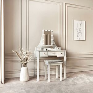 IceCream Living Ltd Exclusive – Arianna Deluxe Designed exclusively for Ice Cream Living, The Arianna Deluxe is the ultimate Hollywood LED Dressing Table & Stool set, fit for a Queen! This dazzling set has been designed to give a luxurious and glamorous feel to your dressing room or bedroom. The Hollywood style mirror features LED lights on a dimmer switch that will give the ultimate glow. Complete with five drawers and internal compartments that are perfect for storing your jewellery, accessories, makeup and other cosmetics. The opulent padded stool adds the perfect finishing touch. The Arianna Deluxe will be a style statement for your dressing room or bedroom for years to come. ? EU DESIGN REGISTRATION NO. 6048734 ? Easy to assemble so you can get glammed up as soon as possible! Tools included. ? Light power source: plug in low volt adaptor ? Colour: White Dimensions: Overall: W80cm x L40cm x H136cm Table Size: W80cm x L40cm x H75cm Mirror Size: W25cm x H40cm Stool Size: W40cm x