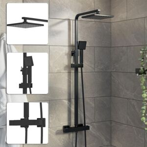 GENERAL DESCRIPTION The Aquari Black Square Thermostatic Shower Valve and Riser System is a stylish, practical, and reliable addition to your bathroom. It features a thermostatic control that maintains a steady temperature, preventing hot spikes when other taps are used. The system includes a large 200mm luxury square drencher head and a modern two outlet bar shower, allowing you to switch between two separate shower heads for a customizable shower experience. The adjustable shower handset offers great performance and a stylish matt black finish. TECHNICAL SPECIFICATIONS 200mm Large Shower Head Single spray pattern Suitable for high pressure and combi boilers systems Pipe Centres: 150mm +/- 3mm Minimum Bar Pressure: 0.5 Bar Maximum Bar Pressure: 5.0 Bar Shower Hose Length: 1500mm Shower Arm Projection: 310mm Shower Top To Bottom Adjustability: 735mm – 1160mm FLOW RATES 200mm Drencher Outlet Flow Rates: 0.2 Bar - 3.6 Litres 0.5 Bar - 4.8 Litres 1.0 Bar - 7.1 Litres 2.0 Bar - 9.8 Litres
