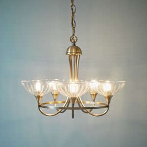 The Whellham from the iconic brand Laura Ashley is a gorgeous 5-armed ceiling pendant light that is going to make a statement in any room. The fitting is finished in a vintage Antique Brass, and curved arms are holding pressed glass shades to beautifully diffuse the light. FEATURES * Ceiling pendant light * Antique Brass finish * Pressed ribbed glass shades * Takes 5 lamps * Double insulated * Dimmable with suitable lamp / dimmer switch * Height adjustable at the point of installation SIZE * Drop: 47 - 143 cm * Dimeter: 46 cm BULBS * Requires 5 x G9 LED lamps - NOT INCLUDED