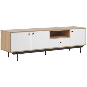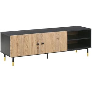 Retro TV Cabinet with Storage for a TV up to 70ʺ. Add a retro touch to your living space with this timeless TV stand. Made from robust and durable materials, the piece features a finish in natural, dark wood tone. The doors of the cabinets are decorated with geometric, white lines which highlight the minimalist design of the stand. Organize your living room thanks to capacious storage, while the cable management system will help you conveniently hide away all the wires. Details: Product Type: TV Stand Style: Modern General Color: Brown Material Type: Engineered Wood Main Material: Particle Board Additional Material: Pine Wood Legs material: Wood Top Material: Engineered Wood Shelves number: 2 Doors Opening: Standard Drawers: No Finish: Matt Number of Doors: 2 Dimensions: Depth: 39 cm Width: 150 cm Height: 51 cm Weight: 26 kg Shelf Weight Capacity: 5 kg Top Weight Capacity: 45 kg Offer Includes: 1 x TV Stand Key Features: Open Shelf for Easy Access, With Cable Management, Works Great
