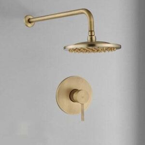 The high-quality brass finish complements the modern, rounded design with a charming vintage touch. Contents: mounting accessories, rain shower head, shower arm, faucet, and trim. Elegant design, rain shower head, easy operation, single lever handle for precise and effortless control of temperature and flow.