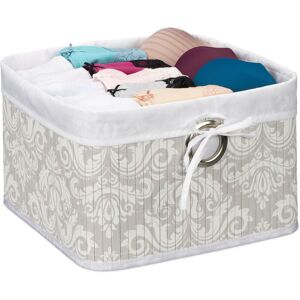 Whether for socks in the wardrobe or accessories, all your items are neatly stored in this practical shelf basket. Thanks to natural bamboo, the storage box is also great for use in the bathroom. Here, the folding box with handle is perfect for storing bathroom accessories or as a towel basket. The square bamboo basket with floral design has a reinforced base and a removable fabric liner. When not in use, the decorative basket can be folded and stored away. Storage Basket Details - Size H x W x D: approx. 20 x 31 x 31 cm - Inner dimensions H x W x D: approx. 18.5 x 30 x 30 cm - Max. load capacity: 3 kg - Weight: approx. 500 g - Material: Bamboo, polyester, steel - Colour: White, light grey Folding Bamboo Storage Basket - Made of flexible bamboo with removable fabric liner - Handle hole makes pulling the basket off a shelf easy - Folding basket with reinforced base - The moisture resistant bamboo makes it perfect for the bathroom or kitchen - Great for storing small items Included in