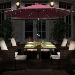 Product Features: -8 Sturdy rectangular powder coated steel ribs. -32 built-in solar powered LED lights, 4 LED lights on each rib. -Comes with a solar panel to store the energy in a sunny place during the day. -Crank winding mechanism to open and close your parasol conveniently. The inclination angle of the umbrella is adjustable. -1.0mm thickness steel tube ensure the structure more durable and stronger. -High quality 180G polyester fabrics and included top vents. Lift slider to extend your parasol outwards. -Enjoy nature, Enjoy life, Enjoy relaxing time in your garden or backyard. Product Specification: -Parasol Diameter: 2.7m -38x1mm Metal center pole -12x18x0.45mm Rib -Parasol Height: 2.35m -Colour: Black Kindly Note: 1. You should better fold the umbrella up during windy days. 2. To ensure the stability of the parasol, you have to weigh down the base with weights(at least 12KG,base is not included) all around.This must be bought separately. 3. Due to the different display and