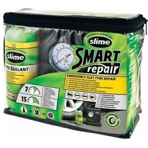 Emergency flat tyre repair Repairs in 15 minutes or less Easy to use Includes: Slime Tyre Sealant 16 oz. with Fibro-Seal Technology High-Power 12 Volt Air Compressor with Built-In Tire Pressure Gauge Inflates a Mid-Size Car Tyre in 7 Minutes 2' Air Hose with Quick-Clip Long 10' Power Cord with A/C Adapter for any Power Accessory Outlet Valve Core Removal Tool & Filler Tube Tools and Adapters for tires, balls, beach toys, air mattresses, inflatables Instructions
