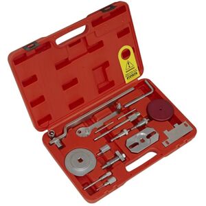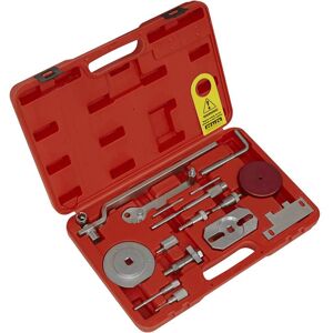 Used for timing 2.2/2.3/3.0D belt and chain diesel drive engines, including the later chain in head versions, usually found in light commercial vehicles. Features a water sensor installation socket, crankshaft turning tool, timing cover centring plate, oil pump setting plate as well as camshaft and crankshaft locking tools. These engines are also found in the Ford Transit. Supplied in storage case. FIAT, FORD, IVECO, PSA - This kit is suitable for 2.2D, 2.3D and 3.0D belt and chain drive engines. TIMING - Reliably set engine timing. DIESEL - This kit is suitable for diesel engines. BELT AND CHAIN DRIVE - This kit is suitable for belt and chain drive engines. WARNING TAG - This kit is supplied with warning tag.