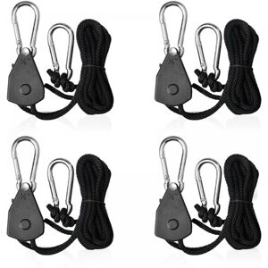 Material Nylon, Alloy Steel Color Black Number of Pieces 2 About this item Fully adjustable and lockable for minimal effort Material: Rope-Nylon, Hooks-Steel. High tear and rust resistance Simply install a quick-release carabiner to secure the object, then pull the rope to the desired height Capacity: 300 lbs / 136 kg per pair; Rope length: 2.4 m; Include: 2 pairs of 1/4 inch adjustable rope ratchets Application: Ideal for hanging lights, hanging reflectors, high faucets, carbon filters and ventilation installations