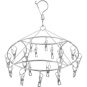360 Degree Swivel Hook: Circular design with 31cm diameter, more space when you rotate or bend the arm. Anti-lost Drying Rack: Features a windproof hook and 20 strong metal clips that totally protect your clothes on the sock drying rack firmly, no worry about being blown away. Suitable for Clothesline and Rotating Rope: Packed with a 4cm diameter hook, this drying rack is suitable for most clothes rails, and all clotheslines, rotating ropes. Lightweight to Carry Easily: Although the sock hanger is completely made of solid stainless steel, but only about 390g. It is so lightweight that you can wash 20 small clothes outdoors each time. Save a lot of time. Care Tips: Don't leave the dryer outside indefinitely as it will rust for a long time. Put it inside when it rains. Longer life with regular cleaning.