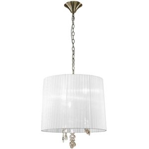 This Mantra Tiffany 3+3 light single ceiling pendant light is finished in antique brass and comes complete with a soft bronze shade.ᅠ This elegant light has discreet lampholders under the shade and the individual lights hang amongst crystals, which encourages added sparkle when illuminated.ᅠ This prestigious light would make a stunning addition to any room. Product code: M3880 FEATURES: * Finished in antique brassᅠ * Comes complete with soft bronze shade * Dimmable - suitable lamps required * Matching lights in the range available (please see website) * Earthed * Fully height adjustable at the point of installation SIZE: * Minimum height - 700mm * Maximum height - 1560mm * Diameter - 500mm BULBS: * Takes 3x 15 watt E14 Small Edison Screw and 3x 3 watt G9 LED lamps - Not included
