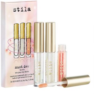 Introducing this must have lip trio from Stila... This Must Dew Lip Trio contains three travel sized Heaven's Dew Lip Gel Oils in Kitten Komet, Supernova and clear Rain Drop shades. Key Benefits: - Hybrid, gel-based formula that transforms into a hydrating lip oil when worked into the lips - Non-sticky, high-shine finish - Infused with Antioxidants, Hyaluronic Acid and Jojoba Seed Oil - Instantly nourishes, protects, softens, and revitalizes your lips, leaving them looking smooth and naturally plumped. - Large doe-foot applicator makes for easy application. Kitten Komet has a rose gold lustre from suspended glitter particles that float in the clear base formula and glisten on your lips to leave a uniquely divine, shimmering effect. Supernova has an iridescent lustre from suspended glitter particles that float in the clear base formula and glisten on your lips to leave a uniquely divine, shimmering effect. Rain Drop is a clear lip oil. Ingredients: Kitten Komet: HYDROGENATED POLYISOBUTENE, POLYBUTENE, CAPRYLIC/CAPRIC TRIGLYCERIDE, LIMNANTHES ALBA (MEADOWFOAM) SEED OIL, OCTYLDODECANOL, ETHYLENE/PROPYLENE/STYRENE COPOLYMER, VANILLIN, ETHYLHEXYL PALMITATE, SYNTHETIC FLUORPHLOGOPITE, CALCIUM ALUMINUM BOROSILICATE, CAPRYLYL GLYCOL, ETHYLHEXYLGLYCERIN, BUTYLENE/ETHYLENE/STYRENE COPOLYMER, TOCOPHEROL, CAMELLIA SINENSIS SEED OIL, NIGELLA SATIVA (BLACK CUMIN) SEED OIL, SIMMONDSIA CHINENSIS (JOJOBA) SEED OIL, MICA, SILICA, TRIHYDROXYSTEARIN, PENTAERYTHRITYL TETRA-DI-T-BUTYL HYDROXYHYDROCINNAMATE, TIN OXIDE, SODIUM HYALURONATE, GLUCOMANNAN, TITANIUM DIOXIDE (CI 77891), IRON OXIDES (CI 77491). Supernova: HYDROGENATED POLYISOBUTENE, POLYBUTENE, CAPRYLIC/CAPRIC TRIGLYCERIDE, LIMNANTHES ALBA (MEADOWFOAM) SEED OIL, OCTYLDODECANOL, ETHYLENE/PROPYLENE/STYRENE COPOLYMER, POLYBUTYLE NETEREPHTHALATE, POLYETHYLENE TEREPHTHALATE, POLYLACTIC ACID, POLYMETHYL METHACRYLATE, VANILLIN, ETHYLHXYL PALMITATE, CAPRYLYL GLYCOL, ETHYLHEXYLGLYCERIN, BUTYLENE/ETHYLENE/STYRENE COPOLYMER, TOCOPHEROL, CAMELLIA SINENSIS SEED OIL, NIGELLA SATIVA (BLACK CUMIN) SEED OIL, SIMMONDSIA -CHINENSIS (JOJOBA) SEED OIL, TRIHYDROXYSTEARIN, PENTAERYTHRITYL TETRA -D I -T- BUTYL HYDROXYHYDROCINNAMATE, SODIUM HYALURONATE, GLUCOMANNAN . Rain Drop: HYDROGENATED POLYISOBUTENE, POLYBUTENE, CAPRYLIC/CAPRIC TRIGLYCERIDE, LIMNANTHES ALBA (MEADOWFOAM) SEED OIL, OCTYLDODECANOL, ETHYLENE/PROPYLENE/STYRENE COPOLYMER, ETHYLHEXYL PALMITATE, CAPRYLYL GLYCOL, ETHYLHEXYLGLYCERIN, BUTYLENE/ETHYLENE/STYRENE COPOLYMER, TOCOPHEROL, CAMELLIA OLEIFERA SEED OIL, NIGELLA SATIVA SEED OIL, FLAVOR (AROMA), SIMMONDSIA CHINENSIS (JOJOBA) SEED OIL, BENZYL BENZOATE, TRIHYDROXYSTEARIN, PENTAERYTHRITYL TETRA-DI-T-BUTYL HYDROXYHYDROCINNAMATE, SODIUM HYALURONATE, GLUCOMANNAN.