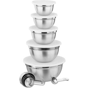 This set with mixing bowls in five sizes is an ideal base equipment for your kitchen. The bowls are excellent for preparing salads or cakes. Thanks to their chic looks, the bowls can of course also be used for serving. What is more, you can also seal the bowls airtight with the fitting lid for secure transport or storage in your fridge. The set also included measuring cups and spoons for precision even when smaller amounts of ingredients are concerned. Using the precise measuring cups, you can easily cook your favourite American recipes. Kitchen Set Details - Total weight: app. 1 kg - Material: Stainless steel, PP - Colour: Silver, white Measuring Spoons & Cups - 4 Cups: 1 Cup (250 ml), 1/2 cup (125 ml), 1/3 (80 ml), 1/4 (60 ml) - 4 Spoons: 1 Table spoon, 1 teaspoon, 1/2 teaspoon, 1/4 teaspoon - Stackable & equipped with metal ring for hanging Lidded Mixing Bowls - Bowl A (H x W): app. 13 x 26 cm - Bowl B (H x W): app. 11.5 x 21.5 cm - Bowl C (H x W): app. 9.5 x 18 cm - Bowl D (H x