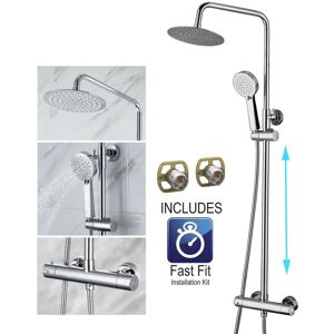 GENERAL DESCRIPTION This solid brass round thermostatic exposed shower mixer valve with a chrome dual kit riser pack features a sleek and modern design. It includes an ultra-thin 8'' (200mm) round shower head with an adjustable swivel joint. The thermostatic shower mixer allows you to control the flow and temperature of your shower, making it suitable for any modern bathroom. The left handle controls the water flow, while the right handle adjusts the temperature, ranging from 20-50 degrees Celsius, with a safety stop preset at 38 degrees Celsius for comfort and safety. The diverter on the bar valve allows switching between the shower head and handheld shower. The riser rail height is adjustable from 800mm to 1150mm, and it includes a 360-degree adjustable bracket for the handheld shower. TECHNICAL SPECIFICATIONS 8'' (200mm) solid brass ultra-thin round shower head with adjustable swivel joint Highly polished 3-layer PVD mirror chrome finish Tarnish and corrosion resistant Built-in